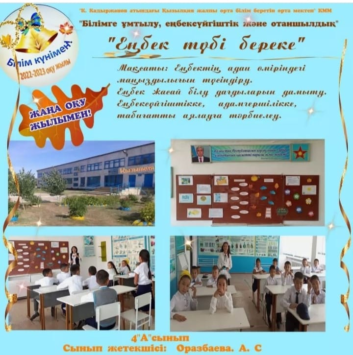 "К.Қадыржанов атындағы Қызылқия жалпы орта білім беретін мектебі" КММ жаңа оқу жылының басталуына арналған "Еңбек түбі береке" атты тәрбие сағаты 4"А" сыныбында өткiзiлдi. #1қыркуйекбілімкүні🎊 #КадыржановЖОББМКММ