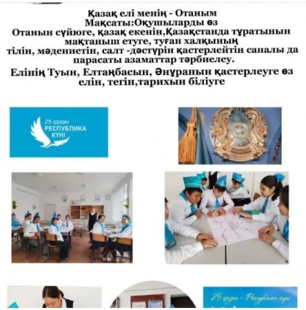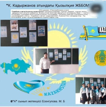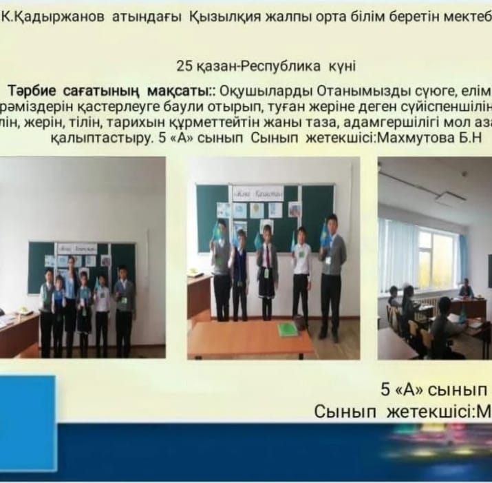 К.Кадыржанов атындағы Қызылқия жалпы орта білім беретін мектебі.25казан-Республика күніне орай ашық тәрбие сағаты болды.Тәрбие сағатының мақсаты.Оқушыларды Отанымызды сүюге,еліміздің рәміздерін қастерлеуге баули отырып,туған жерге деген сүйіспеншілігін,елін,жерін,тілін,тарихын құрметтейтін жаны таза,адамгершілігі мол азамат қалыптастыру.