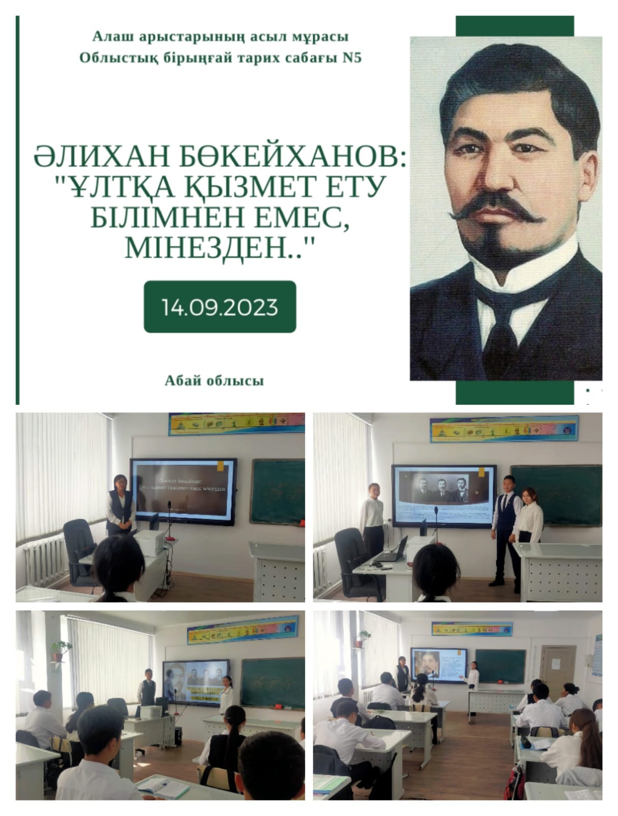 14.09.2023ж. Абай облысы білім басқармасы Аягоз ауданы бойынша "К.Кадыржанов атындағы Қызылқия жалпы орта білімі беретін мектебі" КММ де облыстық инновациялық - әдістемелік орталығы ҚР президенті Қ.К.Тоқаевтың "Тәуелсіздік бәріне қымбат" мақаласы аясында Алаш арыстарының асыл мұрасын игеруді жалғастыру мақсатында іс-шаралар ұйымдастыру бойынша 11 "А" сыныбында "Біріңғай тарих сабағы" өткізілді. Алаш арысы "Әлихан Бөкейханов: елге қызмет білімнен емес, мінезден" атты халқымыздың тұңғыш саяси Алаш партиясының ұйымдастырушысы және ұлттық Алашорда автономиялы үкіметтің төрағасы, ғұлама ғалым, әдебиеттанушы, аудармашы, әрі дарынды публицист жайлы ақпараттар беріліп, бейнебаян көрсетілді. Тарих және география пәндерінің мұғалімі: Оралбаева С.К