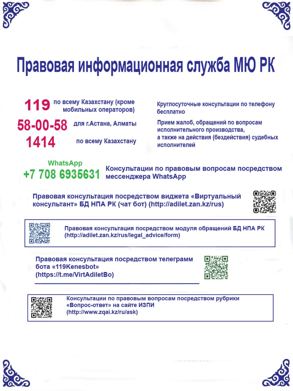 Білім басқармасы Қазақстан Республикасы Президенті Қ. К. Тоқаевтың азаматтардың құқықтық сауаттылығын арттыру туралы тапсырмасын жүзеге асыру бойынша Абай облысы Әділет департаментінен келіп түскен 2023 жылғы 13 қыркүйектегі № 18-06/711-И хатқа қосымша ретінде тіркелген құқықтық ақпараттық қызметі туралы инфографика мектептің ақпараттық тақтасына орналастырылды.