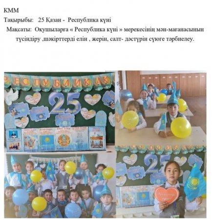» 25 Казан- Республика күні. Мақсаты: Оқушыларға "Республика күні"мерекесінің мән-мағынасын түсіндіру,шәкірттерді, елін,жерін,салт-дәстүрін сүюге тәрбиелеу.