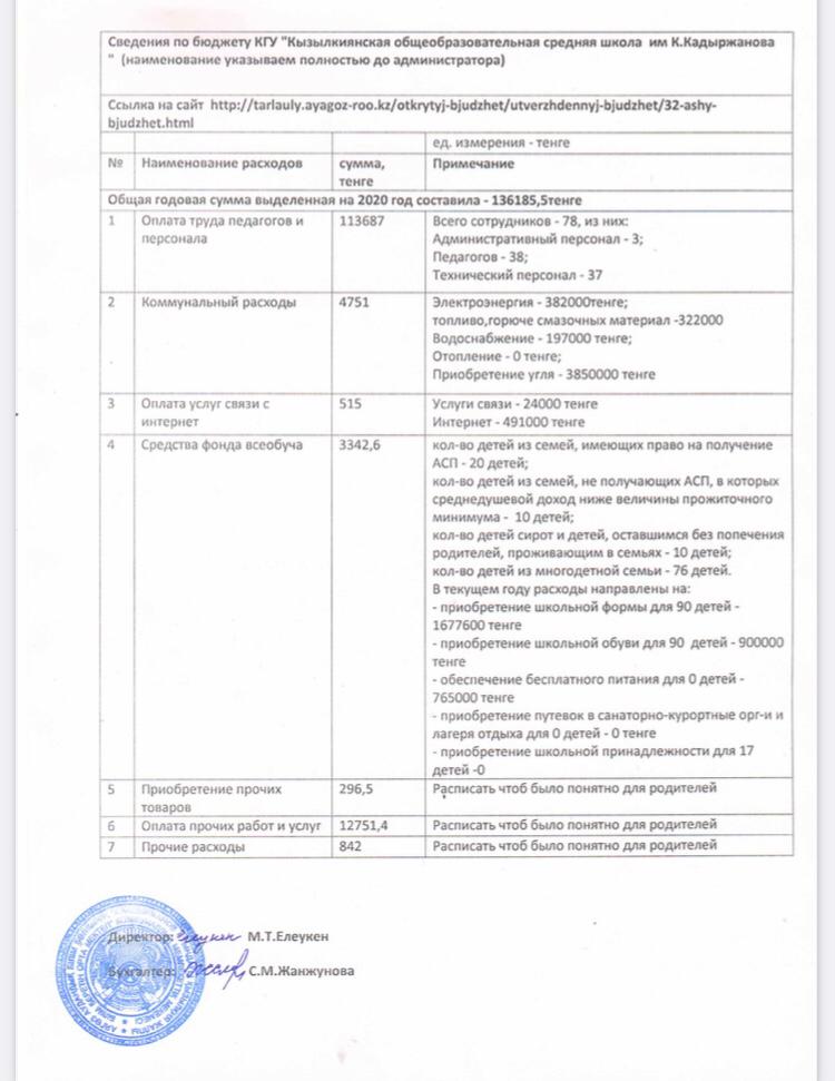 Сведения по бюджету КГУ "Кызылкиянская ОСШ им. К.Кадыржанова"
