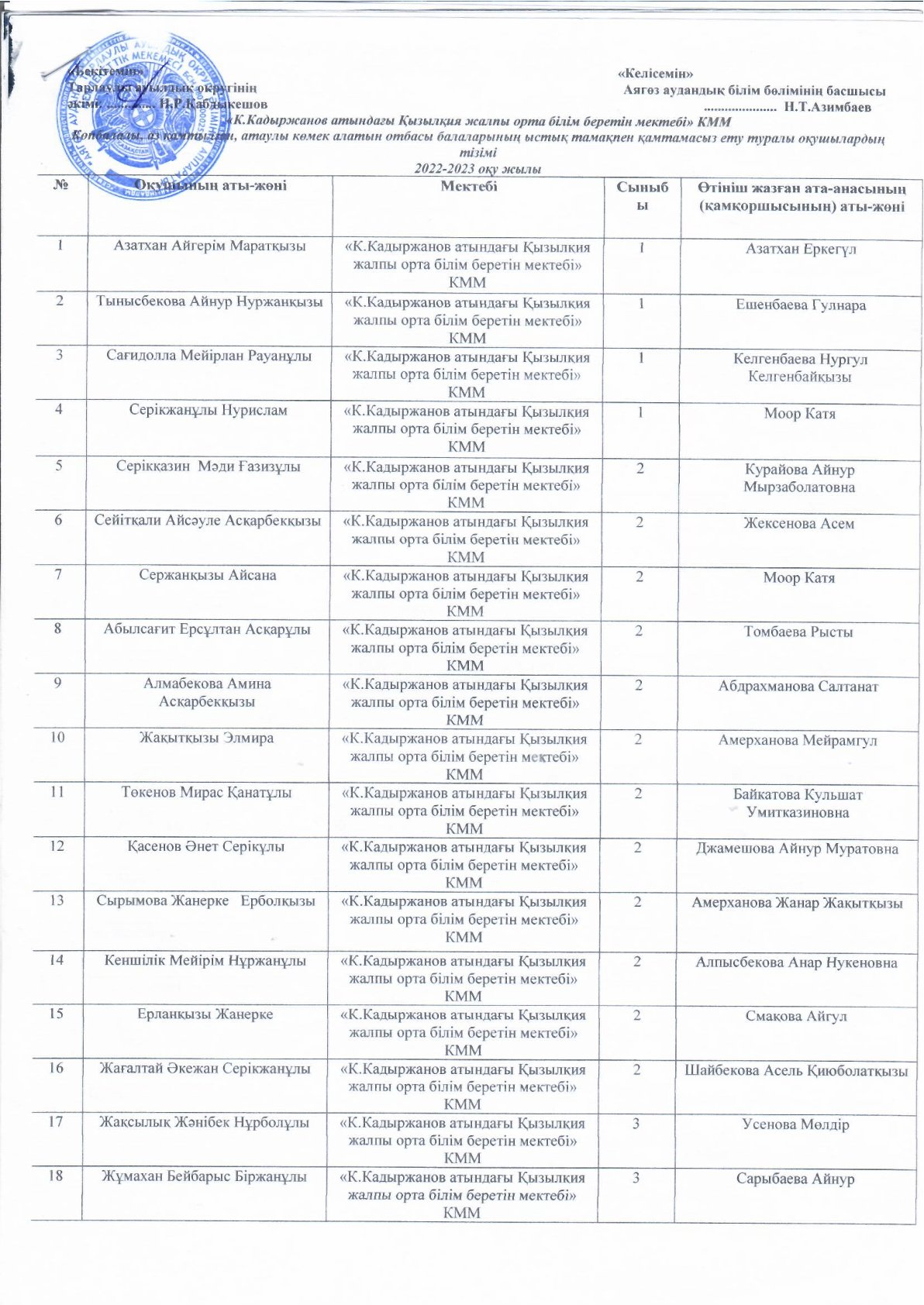 2022-2023 оқу жылындағы ыстық тамақ ішетін оқушылар тізімі