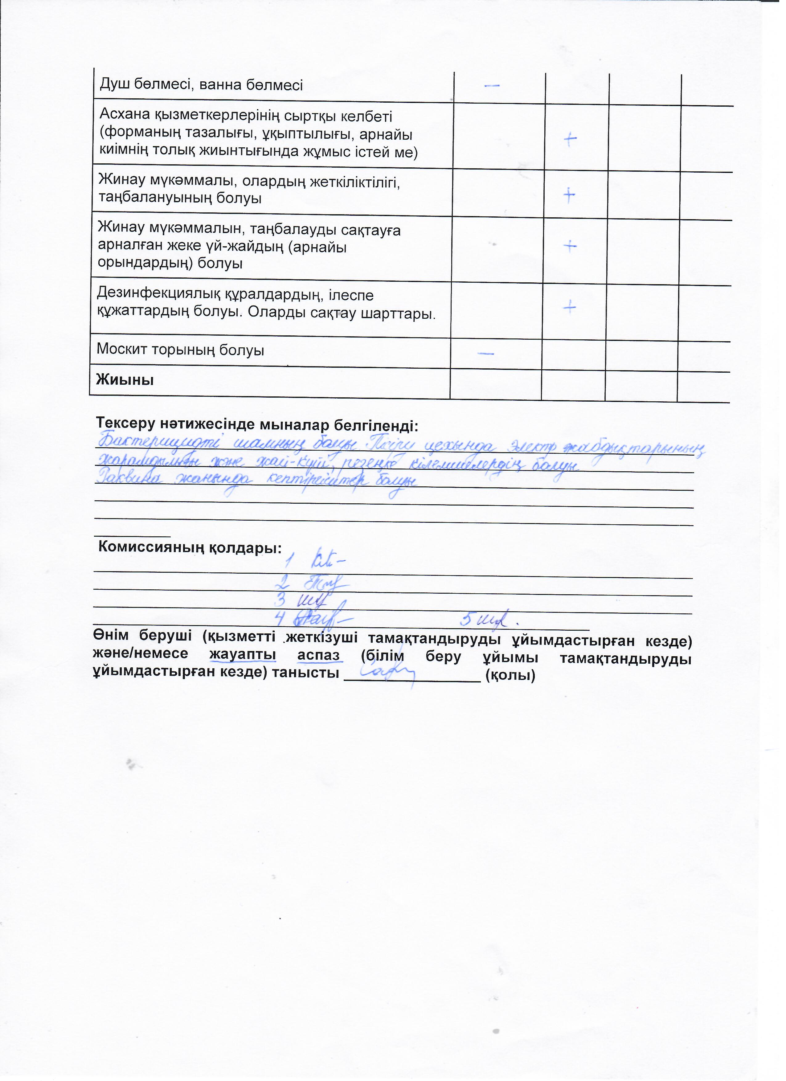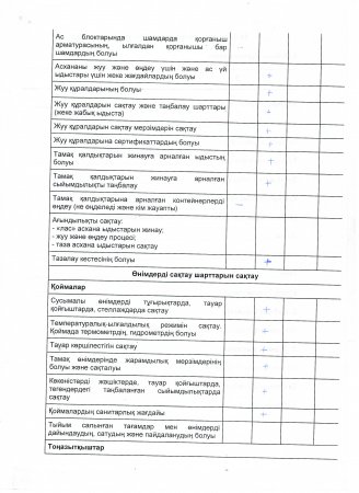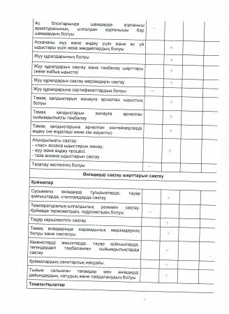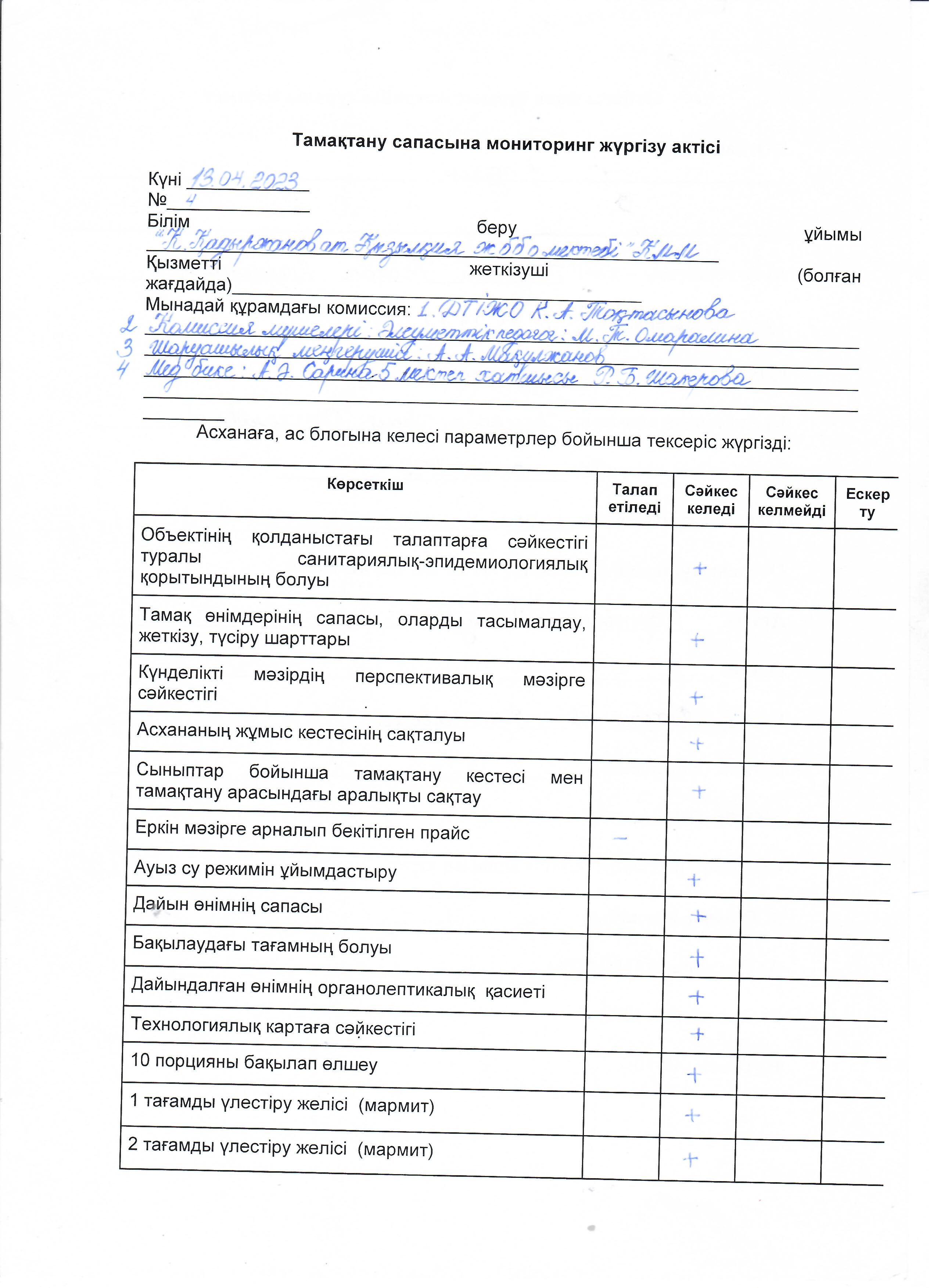 Мектеп сайты » Питание » "К.Қадыржанов атындағы Қызылқия ЖОББМ"КММ бойынша сәуір айында асхана тексеру барысында бракераждық комессияның жасаған актісі,хаттамасы және тамақтану сапасына мониторинг жүргізілді.