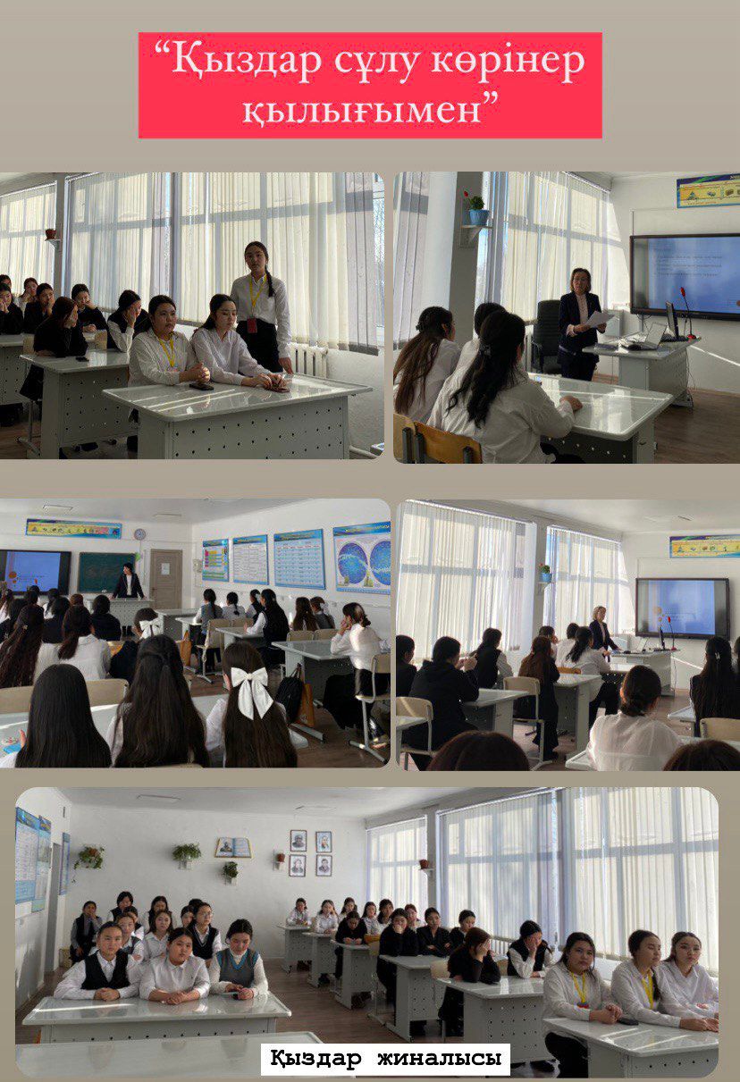 Қыздар кеңесінің төрағасы,зерттеуші,технология пәнінің мұғалімі Е.Тыныбаева "Қыздар сұлу көрінер,қылығымен"деген тақырыпта баяндама жасап,қыздармен пікір бөлісіп,ойларын тыңдады.