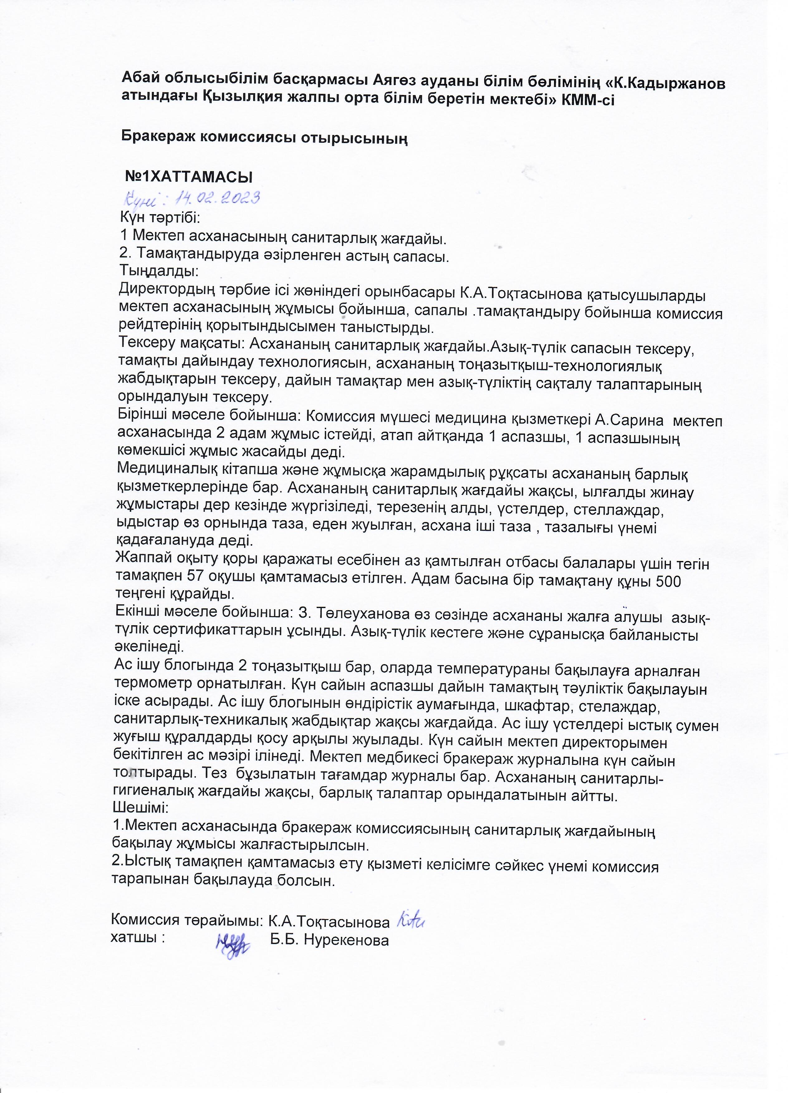 Абай обылысы білім басқармасы Аягөз ауданы білім бөлімінің "К.Кадыржанов атындағы Қызылқия жобб мектебі"КММ.Бракераж комиссиясы отырысының №1 хаттамасы.