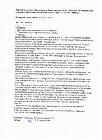 Мектеп сайты » Питание » Мониторинг качества питания » Абай обылысы білім басқармасы Аягөз ауданы білім бөлімінің "К.Кадыржанов атындағы Қызылқия жобб мектебі"КММ.Бракераж комиссиясы отырысының №1 хаттамасы.